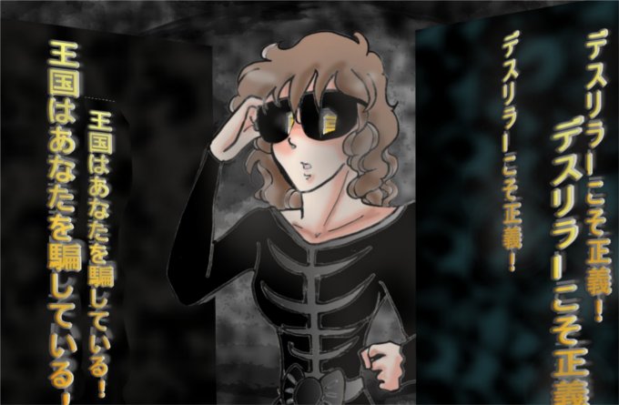 | 『王国を信用するな!!』 『国民は国王に騙されている!!』 『ジャカスラック領を、国として独立させよう!!』 『お前らは奴隷だ!!』 『世間に復讐したくないか!?』 『全ては欲望のままに!!』 『馬鹿の考え、休むに似たり!!』 『混沌は素敵!!』 『デスリラー完璧!!』 その他もろもろの王国を卑下し、自分に悪意を向け、反乱を扇動する言葉がポスターの中で踊っている。 それだけではない。視界に入る路地裏の子供の落書きや、ちょっとした裏酒場の看板がその様なメッセージへと大きく変貌している。 『王族は全て馬鹿者だ!!』 『お前らも全て馬鹿者だ!!』 『お前らはエリートだ!!』 『さあ闘争しよう!!』 『ようこそ!! デスリラーへ!!』 このサングラスは洗脳装置だと二人が気づいた時にはもう遅かった。 視界のグラグラが治まった時には、二人の心はすっかり落ち着いていた。 デスリラーの戦闘員として。 その時、隠れていた男がこの路地裏の奥からゆっくり歩いてきた。 「……デスリラー最高! アンナどん、ビリーどん。ひさしぶりに会ったけど、どうやらすっかりとおい達の同朋として染まったみてえだっぺな」 カニと人間を混ぜたかの様な特異な姿。 右手の先に据えられた大きなチェーンソー。 間違いない。アッシュだ。 しかしサングラスをかけた今の姿の名は、カニチェーンソーだった。 そしてその登場を新しいサングラスをかけた二人は驚きなく、素直に受け入れていた。 「あんたらはデスリラーの戦闘員としても別格の強さみてえだべな。Drデストロイどんに会えば改造人間になって幹部としてデスリラーに貢献出来るわいな」 「イーッ!」 「イーッ!」 アンナとビリーは戦闘員として同意の声を挙げた。 「今デストロイどんはパルテノンにはいねえけど、何、すぐに帰ってくるばい。とりあえず『クジラフリーザー』どんに会わせるか……」 カニチェンソーが二人の先に立って、路地の奥へと歩き出す。 その時。 「兄ぃ! 眼ぇ醒ますんんやぁ!」 路地の入り口で詰まっていたレッサーキマイラが突然走り込んできて、ビリーの頭をハリセンでしばいた。 衝撃でビリーの顔からサングラスがふっとぶ。 「何しやがるんじゃ! てめえ!」 カニチェーンソーが振り向きざまにチェーンソーを駆動させ、レッサーキマイラに斬りかかる。 と、その後頭部を、ビリーにサングラスを外されたアンナは戦闘用モップで一撃した。 怪人は地べたに思いきり滑り込む。 「あっぶなー! これかけている間は外そうなんて気持ち起きんかったわ!」 ビリーは、アンナのサングラスを外すのに『神足通』で間一髪、間に合ったヒヤヒヤ感を味わっていた。 「これが戦闘員を増やしていた秘密でしたのね……」 アンナはサングラスを踏み潰した後、モップで破片を脇へどかした。 頑丈な身体を持っているカニチェーンソーがゆっくりと起き上がろうとする。 「アッシュさんも眼ぇ醒まさんかい!」 ビリーは『伝説のハリセン』で怪人の頭を思いっきりはたいた。 するとスパコーン!という小気味よい音が高く、カニチェーンソーの頭からサングラスがすっ飛んだ。 ビリーは仮にアッシュと再会してもデスリラーに洗脳されている可能性が高いと思い、心理系の状態異常であると解釈して、とにかく様様なアプローチを試行錯誤しながら洗脳解除するつもりだった。 だが、サングラスを外すというシンプルな方法ですむならそれに越した事はない。 カニチェーンソーと名乗った怪人は起きる途中で動きがフリーズしていた。 「あれ……おいは一体何をしとるんばってん……」 「眼が醒めたのですね、アッシュ……!」 頭を振りながらようやく起き上がったアッシュに、アンナの顔は明るくなる。 「よかったー。アッシュさん。エイプマンさんが捜してはったで」 「……おいの家にこの右腕をチェーンソーに改造してくれた医者がまたやってきて……で、このサングラスをかけろって言われて……それからおいは……そうだっぺ! 確かデスリラーって組織のカニチェーンソーとして王国の大牢獄を襲って……!!」 「とにかく元に戻って何よりです。冒険者ギルドへ行きましょう。エイプマンさんも待っています」 洗脳が解けて愕然としているアッシュを二人は両脇から支える様に路地裏から連れ出す。 「おまさんらも今回はあんがとな」 振り向いてレッサーキマイラへ、ビリーは礼を言った。 「お役に立てて何よりです兄ぃ。……で、こっから抜いてくれまへん?」 レッサーキマイラはつっこんだ時に勢い余って、また狭い路地に巨体がハマっていたのだった。 ★★★ グリングラス領。 領民の日常は避難訓練体制に組み込まれ、ギルド内の錬金術ギルドが片端から検査を受けている。 それでいて大山鳴動は何の成果も産み落としていない。 その日は小さな嵐が訪れ、昼でも空は暗く、強い風に吹き飛ばされる雲には雷光が閃いていた。 領主館の客室のバルコニーに出たクラインは、そこに領主館では決して見られないはずの人影と対峙し