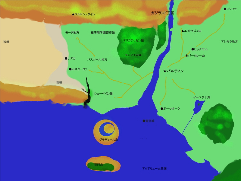 【地理概略】 オトギイズム王国の地理は以下の様になる。 中央の王都は百万都市『パルテノン』。中央に公園と大広場が造られ、それがよりそう様に大時計塔と城壁のある王城がある。パルテノンを囲む壁の北東の壁に、よりかかる様な大牢獄がある。 北方は険しき山岳地帯。この山岳地帯の中にドワーフの国『ガジランド大王国』があり、山羊に乗ったドワーフの騎士達に守られた大鉱山都市『ゴルドシュタイン』がある、オークが多い『サマギニ峠』で少し折れてから少少行った所で街道は山岳に行きづまっている。街道を少し外れた緑豊かな『エイトゥズィ山』は、その頂上に向かう舗装された山道にA〜Zと名づけられた二十六ものカーブが続き、そこを馬で駆け下りる速さを競うのが娯楽となっている。 【オトギイズム世界全体の地理構成】 女公爵に治められた『デリカテッセン領』には『モンマイの森』と呼ばれるドワーフの七人兄弟が住む森と鉱洞がある。またデリカテッセン領には『バッサロ領』というアンデッドに満ちた領地があったが、現在は全てのアンデッドは駆逐されて羅李朋学園都市領と名が変わり、異世界から来た超弩級学園都市飛行船『羅李朋学園』が常駐している。 『パスツール地方』。以前、赤い流星が落ちた場所で森もある丘陵地帯で村が点在する。丘の魔女が住む丘もある。 牧草地が広がる『モータ地方』は山と丘の土地で、牧畜と林業が主産業である。 『シューペイン領』には粉挽き用の風車があり、莫大な小麦畑の巨大なカカシの様で、細い街道はやがて『ガーズ村』の近辺で吊り橋がかかった長く深い谷を渡る。 王都に近接する海辺の港町『ポーツオーク』。オトギイズム王国で一番の港があり、近海の海底には時の結界に守られた『竜宮城』と人魚の王国『アクアリューム王国』がある。 沖の大島『獄門島』。島を二分する北半分と南半分では大きく風景が違い、周囲を断崖絶壁に囲まれて、上陸するには南の入り江からしか出来ない。北半分は荒れ果てた荒野『雷鬼の国』。南半分はパステル色の地勢が広がる『真理王の国』になっている。 海岸に近い『グラディース島』。周囲の他の島と比べて、地質的に異質だ。地形は、島を中心に波紋が広がった様に円く幾何学的にえぐられている。表面に無数にある小さな円形は、まるで宇宙空間で幾つもの小惑星を受け止めたクレーターの様に見える。以前はここに謎の大洞窟があったが、現在は踏破され、奥にあった未来的な異界は根本的に破壊されている。 王国の東方にある『バークレー山』を越えてさらに東へ行くと東西の要衝『ビッグサム』の町がある。大きな丘を掘削して出来た段差を利用したまるでジグラットの様な階段状の町だ。そこから東は和風の雰囲気を持つ『アシガラ地方』が広がる。アシガラの北東の外れ、国境沿いに『遊郭ヨシワラ自治区』という独立都市がある。 王国のまっすぐ東。ハートノエースとトゥーランドットのいる『グリングラス』領があり、これは一時『バグナグ』領と呼ばれたものが名前を変えたものである。元『ジャカスラック』領だ。 西部の大荒野に面した『ムスターファ』はエスニックとアラビアンが交雑したムードの町。荒野は『ナヌカ村』というひなびた村のそばから砂漠が始まっている。 オトギイズム王国は空の月にも住人がいる。『月世界』にはバニームーンことかぐや姫が治める独自の国で、住んでいる動物は形や生態は様様なれど、オーストラリアの有袋類の如く全てはウサギ類の亜種である。これは月世界人も同じである。 |